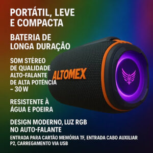 A autonomia da bateria é de até 4 horas, permitindo que você aproveite suas músicas favoritas sem interrupções. O tempo de carregamento é de apenas 2 horas, o que significa que você pode voltar a usar sua caixa de som rapidamente. Além disso, conta com luzes LED RGB que criam uma atmosfera vibrante, tornando cada momento ainda mais especial.
